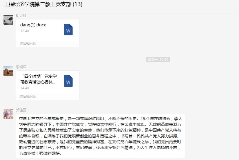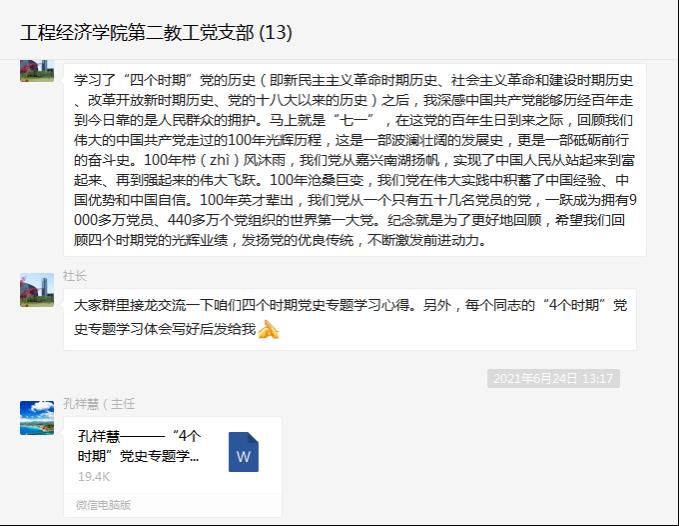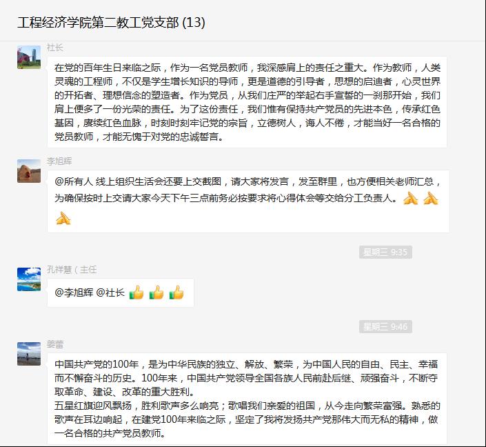 6月29-30日,新葡萄官网第二党支部举办线上“四个时期”党史学习教育生活会。支部党员畅所欲言,谈体会,谈感想,回顾中国共产党百年历史中为了建立新中国、为了中华民族的复兴所做出的牺牲和建立的丰功伟绩,并结合自己的实际深入探讨对党史学习教育活动的认识。