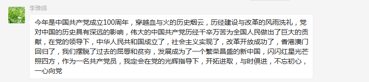 李雅鸽认为,今年是中国共产党成立100周年,穿越血与火的历史烟云,历经建设与改革的风雨洗礼,党对中国的历史具有深远的影响,伟大的中国共产党历经千辛万苦为全国人民做出了巨大的贡献,在党的领导下,中华人民共和国成立了,社会主义实现了,改革开放成功了,香港澳门回归了,我们摆脱了过去的屈辱和贫穷,发展成为了一个繁荣昌盛的新中国。作为一名共产党员,要不断开拓进取,与时俱进,不忘初心,一心向党,在本职岗位上做出自己应有的贡献。