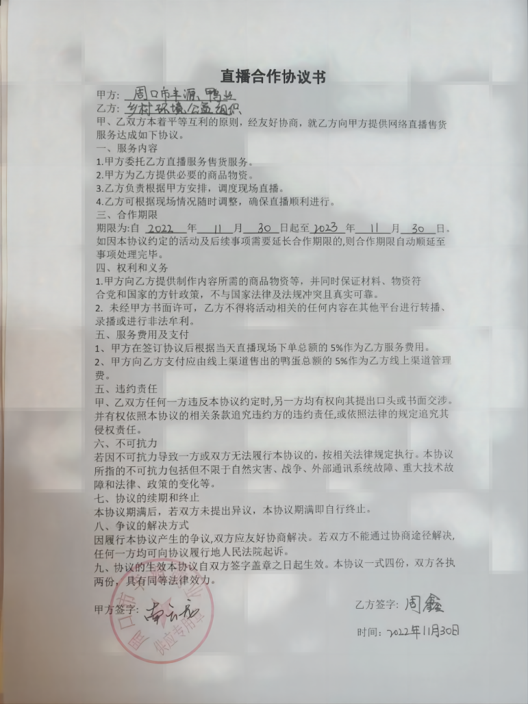 新葡萄官网“创画中乡村,建梦里阡陌”实践团队自2022年11月30日与周口市丰源鸭业签订协议正式合作以来,坚持开展助农直播线上拓展活动。团队成员通过抖音等平台展示当地特色咸鸭蛋,介绍丰源蛋鸭养殖传统和腌制工艺等情况。主播们通过现场试吃和趣味活动等方式展示产品品质,声情并茂、生动有趣的直播引得众多网友围观,直播累计收获粉丝1029个,视频最高浏览量达3000余次。