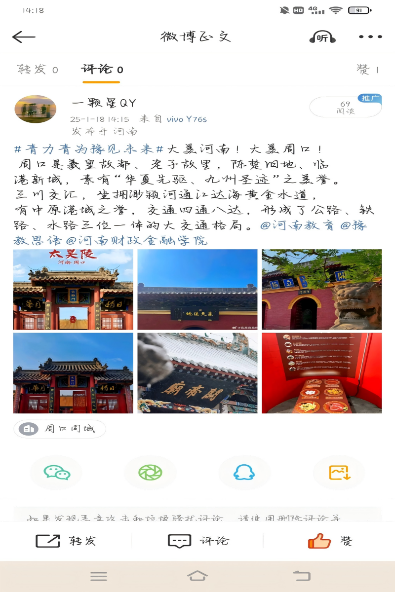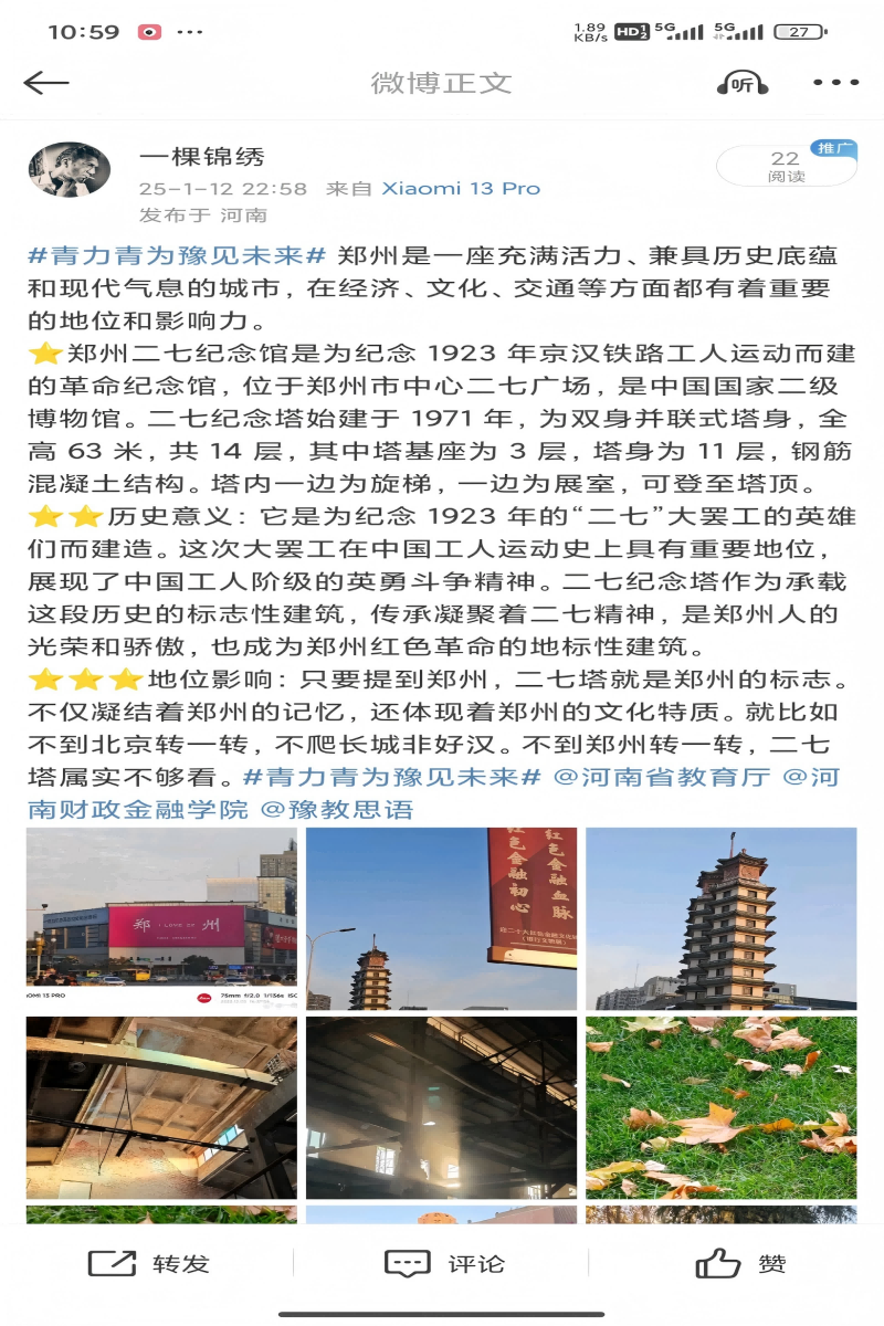 本次活动在新浪微博平台开展主题网络话题互动讨论。自活动启动以来,新葡萄8883官网amg通过线上线下相结合的方式,对活动进行广泛宣传,号召学院全体学生积极参与。活动期间,同学们通过拍摄短视频、照片讲述自身故事,不仅展现了科技为生活和学习带来的变革,还深入挖掘河南历史文化底蕴和风俗,让更多人领略到河南的独特魅力。同学们用心感受家乡巨变,挖掘时代故事,发现最美河南,以积极向上的精神面貌为活动增添了许多活力与色彩。活动共收到作品数百篇,充分展现了新时代青年的担当。