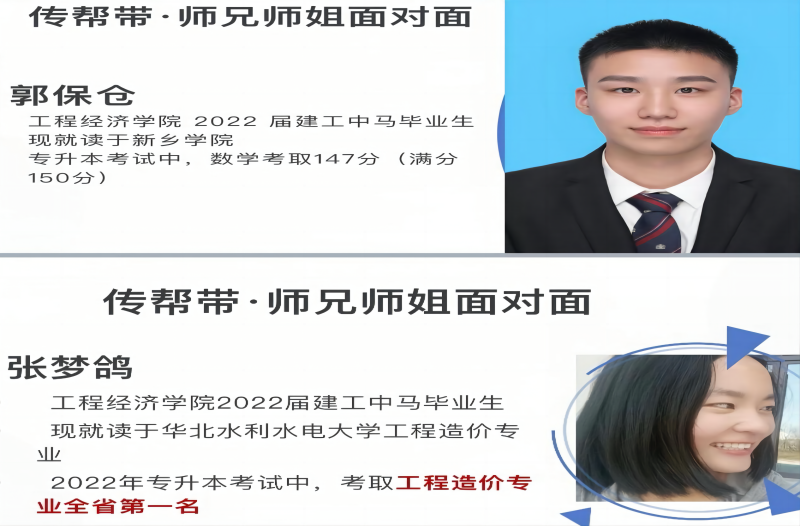 本次经验交流会邀请到新葡萄官网2022届优秀毕业生郭保仓同学(现就读于新乡学院,2022年专升本考试中,高等数学147分)与张梦鸽同学(现就读于华北水利水电大学,2022年专升本考试中取得工程造价专业全省第一的成绩)进行经验分享。他们结合自身专升本的备考经历,详细介绍了报考院校及考试科目、考前资料收集、相关政策等,针对日常学习方法及复习期间的心态调整等问题,向师弟师妹们提出了良好的建议,鼓励大家,明确目标、坚定信心,努力学习,积极进取。在交流互动环节中,两位同学认真解答了学弟学妹们在复习过程中的困惑,提醒大家要时刻关注近年来专升本考试政策的变化,建议报考适合自己的学校和专业,尽量少走弯路,并祝愿同学们考出理想的成绩。他们恳切的言辞、用心地分享,赢得了在场学生们的阵阵掌声。(郭蓓蓓/文 王丹丹/图 车湘辉/审核)