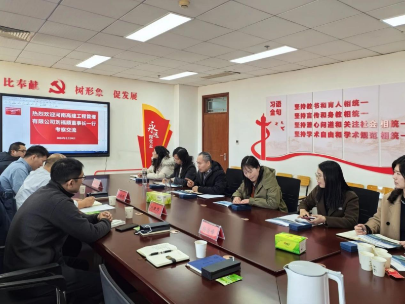 2月26日,河南高建工程管理有限公司与新葡萄8883官网amg新葡萄8883官网amg校企合作会议顺利召开。公司党支部书记、执行董事刘福顺带领副总经理刘亚帅、科技研发部杨俊峰、人力资源部孙军旗、市场经营部徐少波一行,前往新葡萄8883官网amg交流学习,新葡萄8883官网amg院长杜兴亮、副院长王领、李旭辉、李保华以及相关专业老师参加会议,共同探讨校企合作事宜。