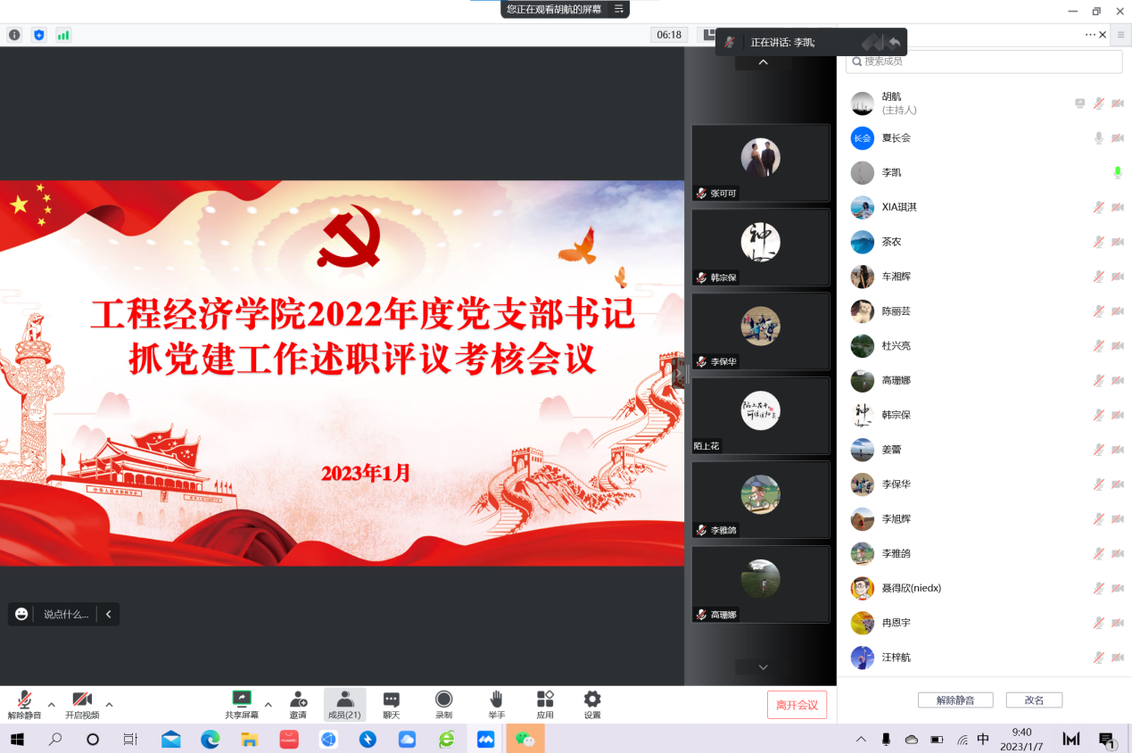 根据学校年度工作安排,1月7日,新葡萄8883官网amg召开2022年度党支部书记抓党建工作述职评议线上考核会议。学院党政领导班子成员、各党支部书记、各科室负责人、师生代表参加会议。会议由党总支副书记刘星主持。