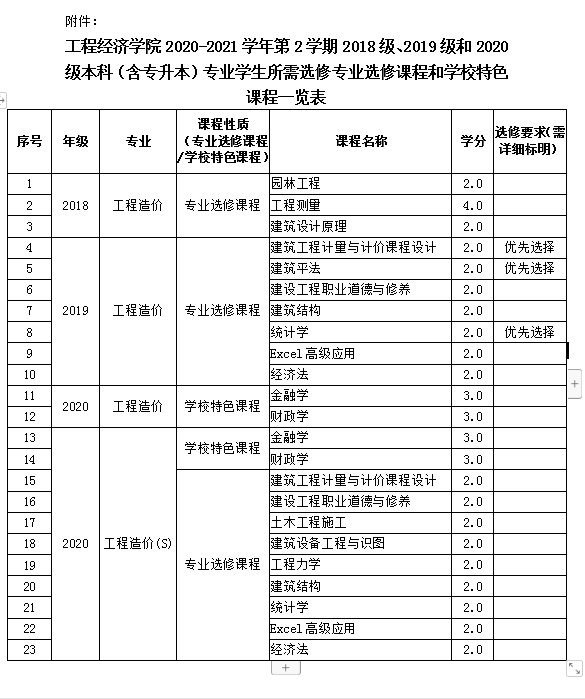 根据本学院2018级、2019级和2020级本科(含专升本)专业人才培养方案,制定出《新葡萄8883官网amg2020-2021学年第2学期2018级、2019级和2020级本科(含专升本)专业学生所需选修专业选修课程和学校特色课程一览表》(附件)。请相关学生按照学校规定时间参照选课。