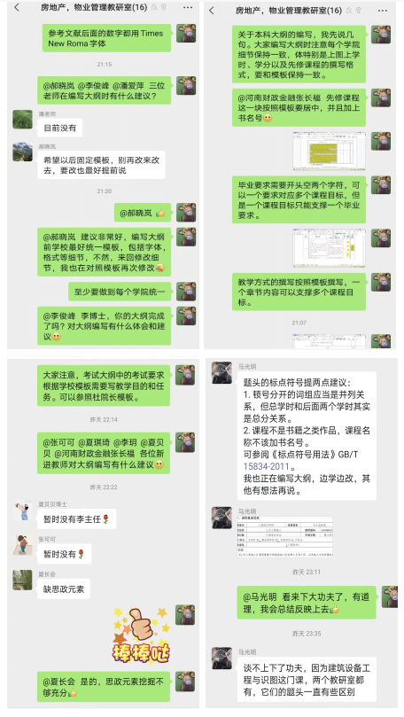 研讨过程中,教研室教师根据学校的文件精神,结合房地产专业的特点,分别就课程大纲的格式、细节、前后课程的逻辑关系、教学方式和手段的多样化和课程思政元素的挖掘等提出了自己的看法。