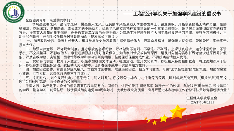 千里之行,始于足下。良好的学风需要你我共同努力。同学们,让我们秉持“明德笃学 知行合一”的校训,自觉践行“勤学善思 经世济民”的学风,勤奋学习,刻苦钻研,以优异成绩向建党100周年献礼,为我校新葡萄官网高质量、有尊严通过本科教学工作合格评估贡献青春磅礴力量!