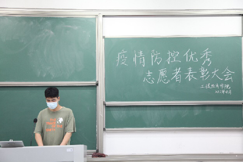 在主持人的主持下表彰大会正式开始,首先由各个优秀志愿者发表获奖感想和它们分别是:18级工造一班李国豪、18级工造三班康梦蕊、19级工造二班楚浩阳、19级工造二班程聪、20城规张嘉媛、20城规张艺、20工管一班蔡欣瑞、20建工中马一班田杨洋、20建工中马一班周航、20建工中马一班田雨鑫、20建工中马二班陈兆祥、20建工中马二班耿寒静、20工造三班余彬、21工造一班王冰、21工造三班闫嘉怡、21工管二班刘煜、21房管一班贺士宇、21房管二班孙静文、21房管尚富豪和21建工中马一班周天宇。接着由各位老师为他们颁发荣誉证书,并做拍照留念。最后在表彰大会临近尾声之时,学生会主席陈兆祥代表老师进行了总结发言,对这些为疫情防控做出贡献的同学给予鼓励和肯定,同时也激励了那些未参与志愿者的同学们在疫情战役中奉献出自己的一