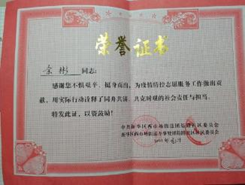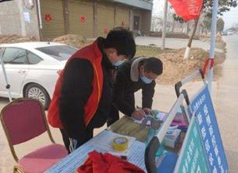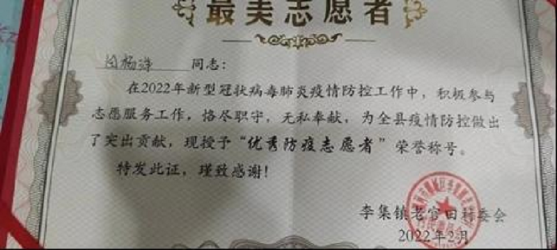 在放假返乡之后,积极的投身于疫情防控,自愿报名在村防疫劝返点当志愿者,暂时归村党支部管理,在村口劝返点服务。每当有行人和车辆通过时,先消毒后登记再放行,同时,对外来人员进行劝返。