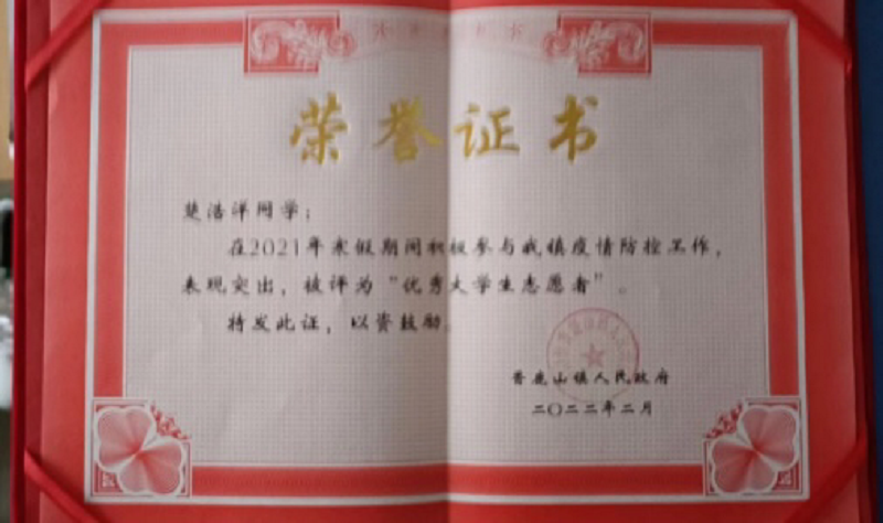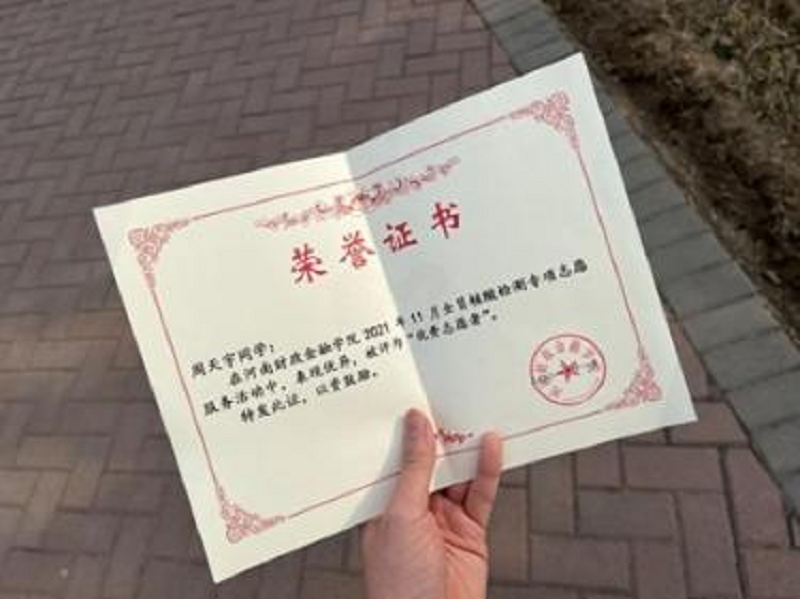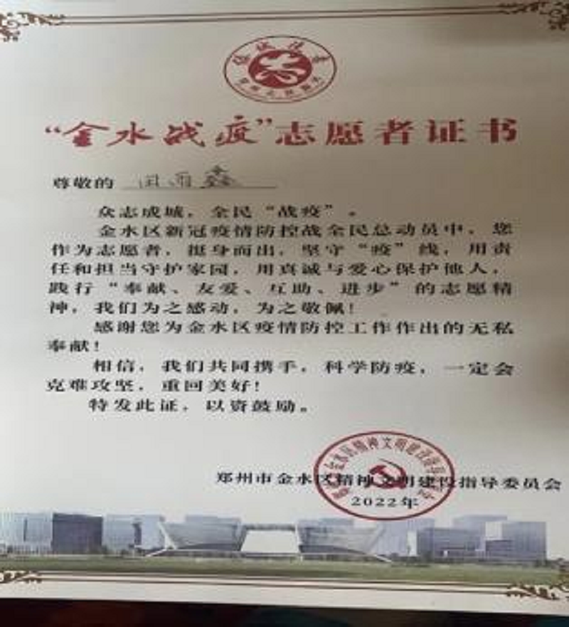 答:“在假期之中参加社区防疫,成为社区防疫志愿者每天准时到达社区核酸点,维护现场秩序,为社区的民众提供服务,指导大家有序的排队进行核酸检测。经过一个月的抗疫工作郑州市的疫情危机得以解除。”