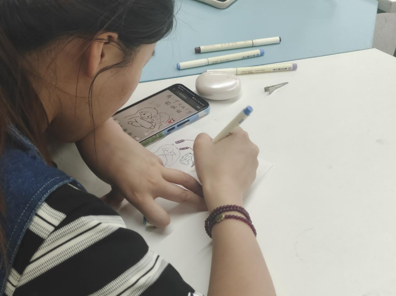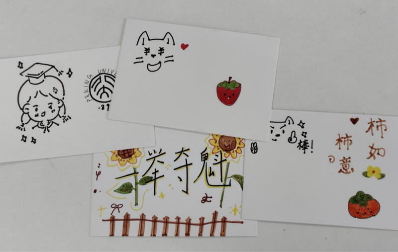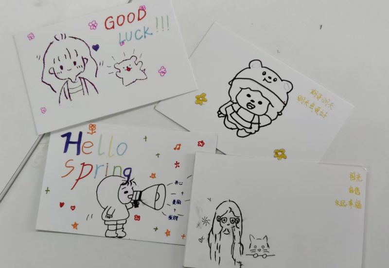 在放松冥想和花式自我介绍以后,现场氛围轻松愉快,同学们打破沉默,主动交流,随后的亲手绘制明信片环节则成为本次活动的一大亮点。创意绘心,搭建心灵沟通桥梁,在小小的卡片上同学们尽情发挥创意,用画笔勾勒出心中无限美好。有人描绘与舍友笑中带泪的温馨回忆,有人勾勒好友间充满希望的未来畅想,还有人以抽象线条传递“开不了口”的细腻情感。绘制结束后,大家将明信片赠予同窗好友、工作伙伴,并附上手写寄语,让这些承载祝福与情谊的明信片成为彼此珍贵的纪念。