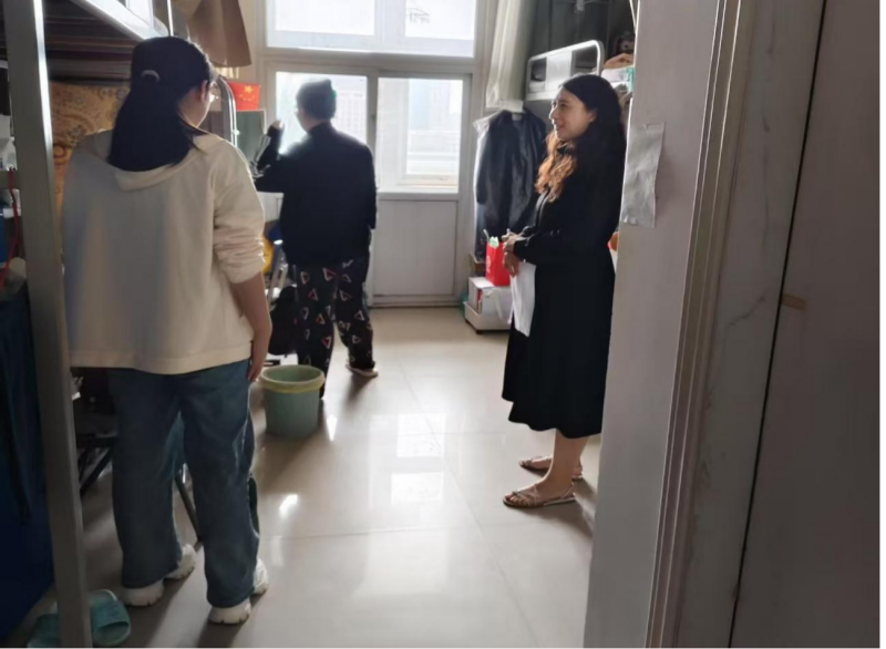 走访过程中,学院领导及辅导员老师与毕业生亲切交谈,详细询问同学们的毕业论文答辩情况、就业去向落实、未来职业规划以及离校前的实际困难。针对“职场适应期如何快速上手”“档案转寄流程细节”等共性问题,王领副院长结合经验为同学们耐心解答,并表示:“从校园到职场是‘理论落地’的过程,保持学习心态最重要,学院永远是你们的后盾”。刘书记则反复叮嘱:“无论未来走到哪里,记得照顾好自己,遇到困难随时联系老师,学院的大门永远为你们敞开。”除了答疑和交流,老师们还细心查看行李打包情况,提醒注意防暑降温、安全离校。