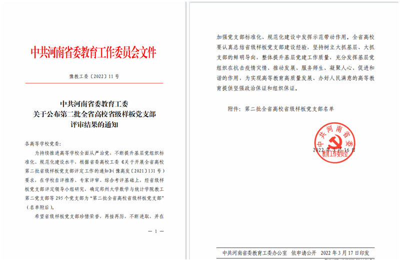 近日,中共河南省委教育工委下发《关于公布第二批全省高校省级样板党支部评审结果的通知》,我校5个党支部入选第二批全省高校省级样板党支部,我院学生第一党支部名列其中。
