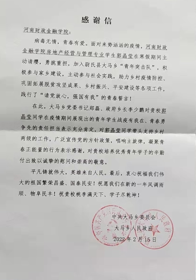 近日,我校收到了一封来自尉氏县大马乡党委、政府的感谢信。信中对我校新葡萄8883官网amg房地产经营与管理专业学生郭晶莹同学在寒假期间积极投身疫情防控和家乡建设表示感谢,对我校培养优秀青年学子的辛勤付出致以诚挚的慰问和崇高的敬意。