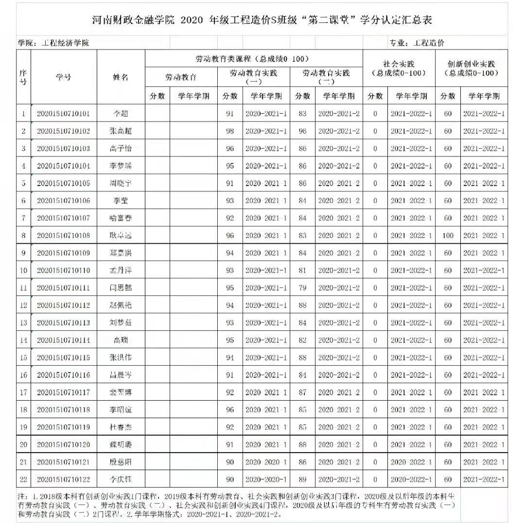 为进一步推进实施素质教育,全面落实立德树人的根本任务,培养具有创新精神和实践能力的高素质应用型人才,鼓励全体同学积极参加第二课堂活动,新葡萄官网以2020级工程造价S本科班为试点班级,开展了对“第二课堂”相关课程学分认定工作。从12月9日至17日,由学生提出课程学分认定申请及佐证材料,辅导员、相关课程老师、学院领导组成学分认定小组,依次对2020级工程造价S本科班22名学生“第二课堂”相关课程的学分进行了认定。现将20工造S班“第二课堂”学分认定成绩公示如下: