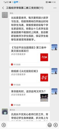 接着党员们结合工作实际发表了自己的看法。疫情期间,我们支部涌现了许多感人的事迹。学校两次防疫值班报名倡议,孔祥慧教授都身先士卒,克服家中也有八十岁老母需要照顾的困难,坚守值班防疫第一线,还常常惦记老师、学生们的身心健康,多次连线老师、学生,询问学习、生活、身体状况;李旭辉老师除需要照顾家里上老人、小孩,做好教学,指导学生实习工作外,还义务担当讲解员,为学院学位评估工作做出贡献;李凯老师多次与老师连线询问工作中遇到的困难,在网课教学方面为科室老师出主意,想办法;聂得新、李凯、胡天顺老师牺牲休息时间整理学位评估资料;马老师毫无保留给大家分享教学工作中的经验做法;姜蕾老师疫情期间积极与学生沟通,排查出因家庭困难不能按时上网课的十几名学生,发动教研室教师为学生捐款,保证学生能够在家接受网课教学。仪建东、谢雯、李雅鸽、丁贝贝老师都是冲在一线的学生工作者,从事学生管理一丝不苟,有条有理,从不懈怠。支部每位党员在抗疫期间表现不仅让我震撼、感动,更让我们看到了党员们“初心使命、争当先锋”的风采。