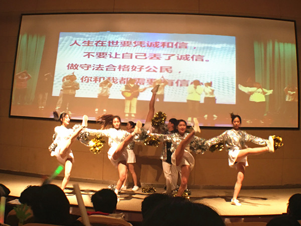 晚会在开场舞《好运来》中拉开了序幕,欢快的鼓点、喜庆的音乐,点燃了现场气氛。歌曲《最美的太阳》带领大家找寻最初的那份记忆,现场的观众也忍不住随之哼唱。相声《成长的烦恼》诙谐有趣,逗的全场哈哈大笑,把气氛推向了一个小高潮。紧随其后的舞蹈串烧和武术表演也毫不逊色,魅力十足。独具特色的戏曲串烧,耳熟能详的《探清水河》,婉约柔美的古典舞,轮番登场,异彩纷呈。歌曲串烧中的《野狼disco》将现场气氛推向了另一个高潮,尖叫欢呼声不断,气氛十分热烈。随后的话剧表演《寻诚启事》,不仅突出了诚信的重要性,也在其中加入了流行元素,引来台下阵阵掌声。健美操、啦啦操的表演更是展现了新葡萄官网学子朝气蓬勃,青春活力的风采。主席团成员们带来的诗朗诵则紧扣晚会主题,寄托了全体师生对新葡萄官网的美好祝福与期盼。最后,晚会在《我和我的祖国》齐声合唱中落下帷幕。