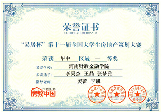 新葡萄8883官网amg对参加大学生大赛十分重视,经过校内选拔、赛前培训、初赛和区域复赛,新葡萄官网17房管专业同学李昊杰、王晶、张梦雅组成的“同路队”在华中区域复赛环节脱颖而出,获得华中赛区一等奖。