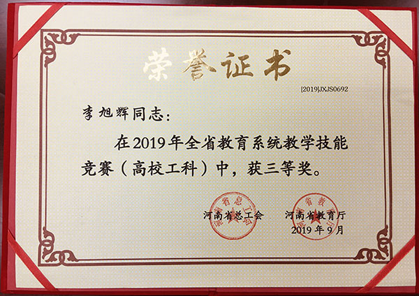 近日,新葡萄官网曹敏、李旭辉两位老师在河南省教学技能竞赛中取得优异成绩。曹敏老师获高校工科一等奖,并被授予“河南省教学标兵”荣誉称号;李旭辉老师获高校工科三等奖。