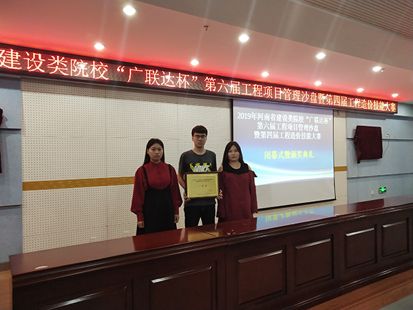 9月19日,2019年“广联达杯”河南省建设类院校第六届工程项目管理沙盘暨第四届工程造价技能大赛在河南科技大学举办。我校新葡萄8883官网amg工程造价专业学生杨军良、郭佳华、吕诗雯组成的代表队荣获本科组一等奖。