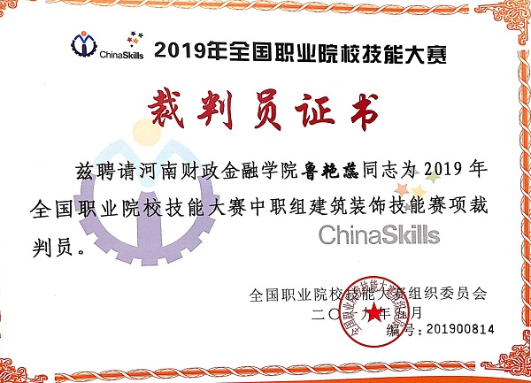 鲁艳蕊老师以饱满的工作热情,一丝不苟的工作态度,出色地完成了工作任务,受到专家组长、裁判长和仲裁长的高度评价。此前,她还应邀担任了4月2日—3日在焦作市职业学校承办的举办2019年全国职业院校技能大赛河南选拔赛“建筑装饰技能”赛项裁判。鲁艳蕊老师连续三年受邀担任全国职业院校技能大赛相关赛项裁判工作,这是对我校教师专业水平的充分肯定。同时通过执裁省级、国家级技能大赛,将进一步积累大赛实战经验,提高我校建筑类专业的影响力与知名度。