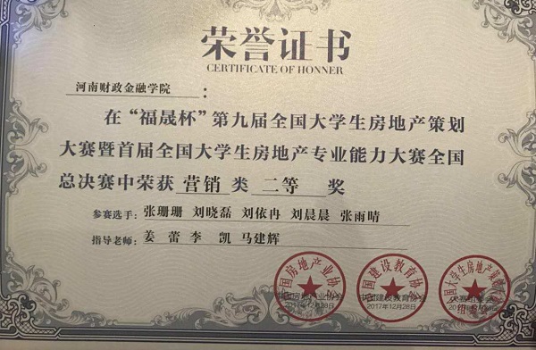 2017年12月25日-29日,“第九届全国大学生房地产策划大赛暨首届全国大学生房地产专业能力大赛”总决赛在重庆举行。由我校姜蕾、李凯、马建辉为指导老师,16级房地产经营与管理专业学生刘依冉、张珊珊等5位学生组成的代表队参加了本次总决赛,并获“营销类”二等奖佳绩。