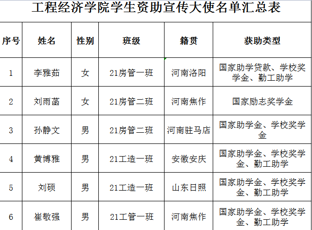 为进一步加大学生资助政策宣传力度,充分发挥受助学生政策传播与励志引领作用,切实提升资助育人实效,根据学校“诚信教育宣传月”活动有关安排,2023年6月上旬,新葡萄8883官网amg组织开展“学生资助宣传大使”遴选工作经过个人自荐、推荐学院评选等环节,6名同学脱颖而出,成功入选新葡萄官网“学生资助宣传大使”,并被推荐参加校级选拔
