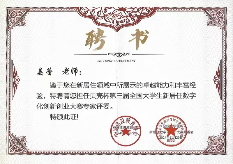 11月30日,由中国建设教育协会主办、华中师范大学承办的“贝壳杯”第三届全国大学生新居住数字化创新创业大赛在武汉举办,新葡萄官网教师姜蕾被聘为大赛专家评委。