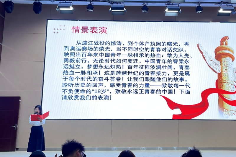 本次主题团日活动通过搭建“沉浸式”红色教育平台,让青年学子在角色扮演中触摸历史温度,在思想碰撞中坚定理想信念,真正实现红色文化入脑入心。此次活动分为初赛、复赛、决赛三个阶段,在前期广泛宣传下,活动吸引了众多学子积极参加。经过选拔,六名优秀学子组成团队,代表学院参加校级主题团日活动创意大赛。备赛期间,参赛者们按时参与节目排练,认真打磨角色台词,揣摩人物形象和情感。比赛现场,大家精神饱满、声音洪亮、情感丰富,向评委和观众展示了学院团支部良好的精神面貌。情景表演以“那一年,中国青年正十八”为主题,通过跨越时空的创意演绎,展现不同时代青年的理想追求与责任担当。该表演在主题团日活动创意大赛中凭借新颖的创意和深刻的内涵,获得评委一致好评。