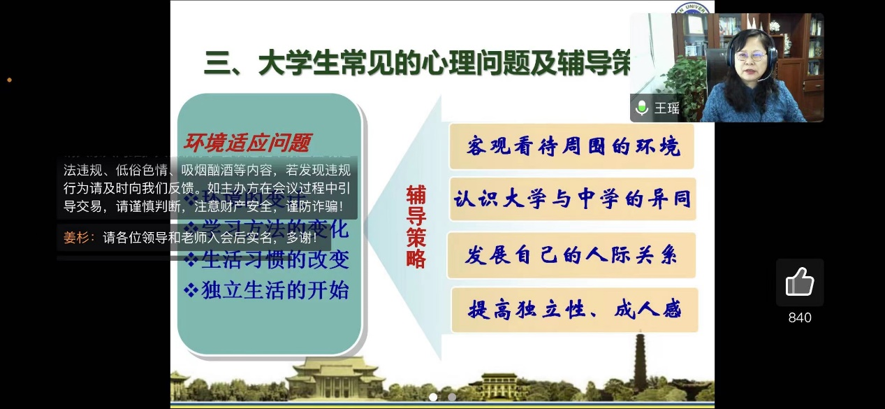 会上,王瑶教授采用案例分析法,从物理角度和精神角度深入浅出详细讲解了心理健康标准,认为在大学生从稚嫩走向成熟的关键阶段,应采用科学的手段进行干预和引导。针对大学生心理问题可以通过问卷调查、精神健康诊断标准、与同龄学生比较、与学生自己既往表现比较等方法进行心理评估,辅导员应通过共情的方式积极引导学生解决实际的心理障碍,维护学生心理健康。