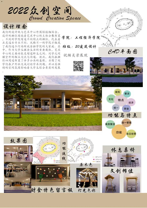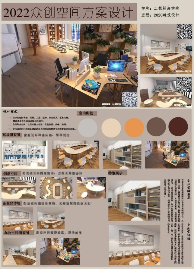 新葡萄8883官网amg结合专业优势,广泛动员、精心组织,积极参赛,参赛作品聚焦财金文化育人主题,立足我校“财经特色鲜明、办学优势突出的应用型本科院校”办学定位,突出“创新文化”“财金文化”,融入生态绿色理念,结合场地功能,整体设计思路清晰、校园文化韵味丰富,充分展现了师生对我校众创空间功能建设的深入思考,以及较强的创新设计能力。