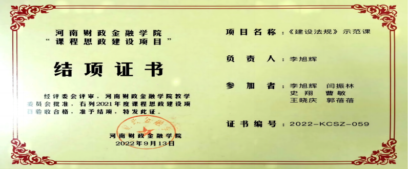 李旭辉老师在担任教研室主任期间,始终秉持党建全面引领高质量发展的工作理念,不断强化政治意识和责任担当,进一步完善“科学、标准、务实”的基层治理机制,持续推进党建与教研室工作深度融合机制建设,倡导“同心、同向、同行”的党建中心工作融合机制;率先示范,以“本科教学迎评促建”工作为切入点,建立“敢于担当,勇于担当”的工作机制;以青年教师师德师风养成为抓手,以课程思政建设为切入点,建立“党建引领、双心驱动”的育人机制,用人才培养质量助力学院发展质量,由她负责的《房屋建筑学》课程被评为河南省一流本科课程,《建设法规》课程被评为课程思政示范课。