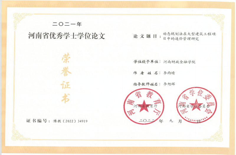 图17 李雨晴同学的论文被评为河南省优秀学士学位论文