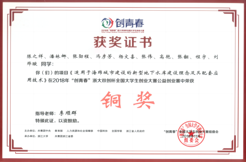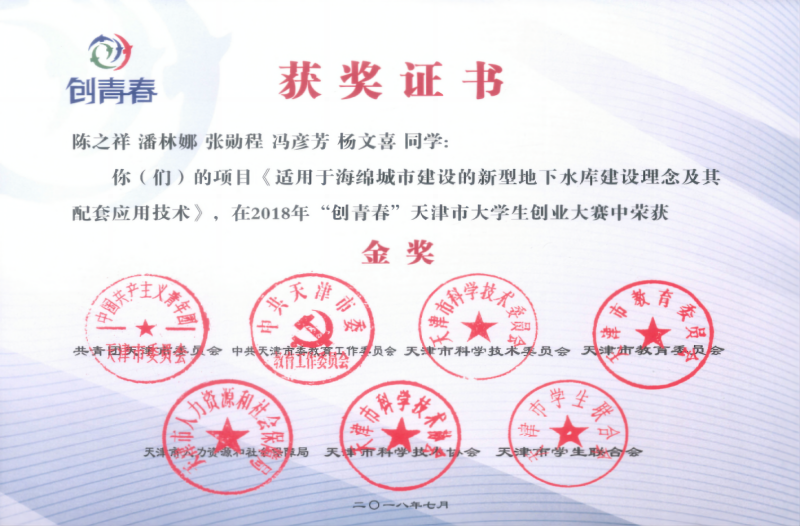 硕士期间,陈之祥聚焦土中三维应力的动态测试需求,主导开发了全自主产权的三维应力传感器,实现了国内从无到有的技术突破。提出了加速入渗-有效调控理念的海绵城市建设技术,将场地入渗速率提升至常规水平的10~1000倍。获得创青春天津市金奖和全国铜奖各1项,技术成果入选住房和城乡建设部全国建设行业科技成果推广项目。获得全国青年岩土力学与工程创新创业奖1项,也是本届获取该奖励的唯一一名学生。