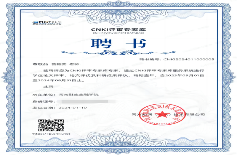 近日,中国知网鉴于所在学科的成就和丰富的学术成果,邀请我校新葡萄8883官网amg鲁艳蕊副教授作为评审专家入驻CNKI专家库。