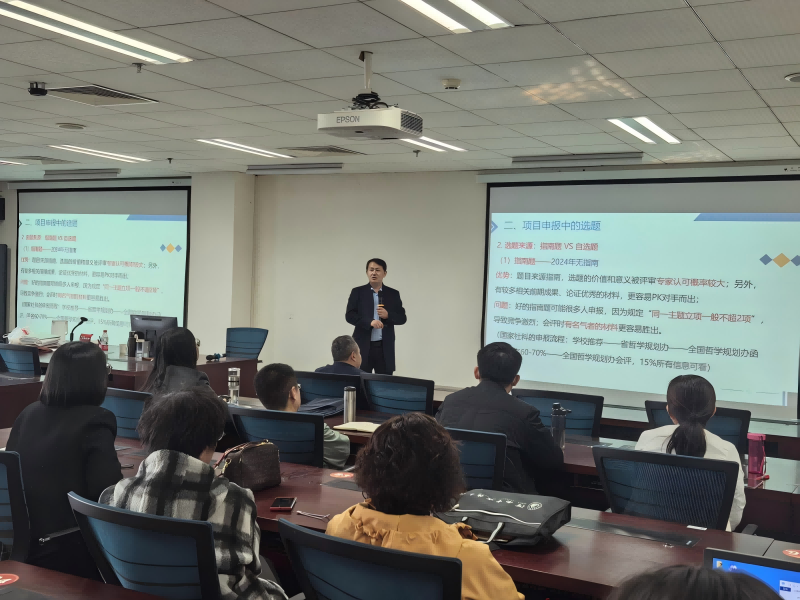 闫超华博士首先从国家级、省部级、省厅级三个方面对科研项目类别进行了分析;随后他结合自己的申报经验围绕国家社科基金的申报流程、选题策略、撰写技巧、评审要点等多个维度,深入浅出地剖析了申报成功的关键要素;最后,闫超华博士与老师们进行了热烈的互动交流,就相关申报问题进行了深入探讨。