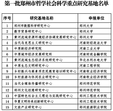 经郑州市社会科学界联合会组织专家评审,我校中原城市经济发展研究所等15个社科研究基地被确定为第一批郑州市哲学社会科学重点研究基地(具体名单如下)。
