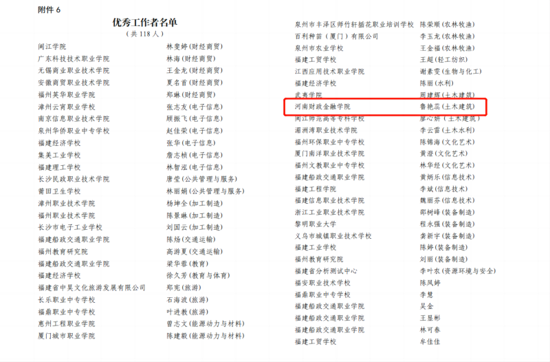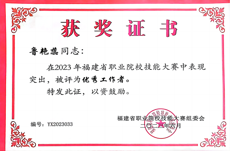 近日福建省教育厅印发了《关于公布2023年度福建省职业院校技能大赛获奖名单的通知—闽职技赛组〔2023〕3号》文件,表彰在该省2023年技能竞赛中的获奖师生及优秀裁判,我校新葡萄8883官网amg鲁艳蕊老师执裁工作认真负责,获评“优秀工作者”