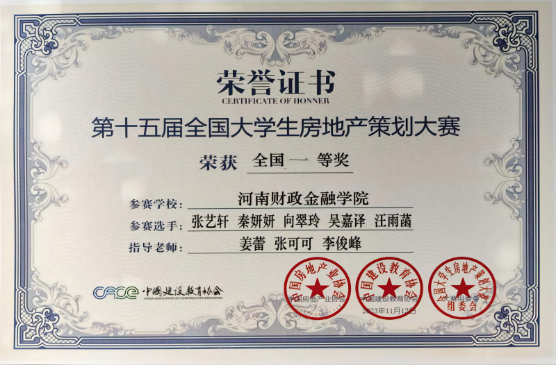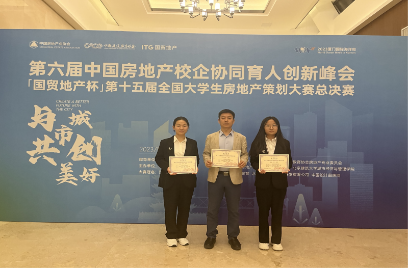 11月12日,由中国房地产业协会指导、中国建设教育协会主办的第十五届全国大学生房地产策划大赛全国总决赛在华侨大学举行。我校2021级房地产开发与管理专业学生组成的代表队参赛并荣获全国一等奖。房地产教研室教师姜蕾、张可可、李俊峰分别获得“优秀指导老师”光荣称号。