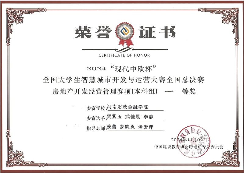 11月2日至3日,由中国建设教育协会主办的2024“现代中欧杯”全国大学生智慧城市开发与运营大赛全国总决赛在石家庄学院举行。2022级房地产开发与管理专业学生贺紫玉、武佳晨、李静组成的代表学校参赛并荣获全国一等奖。房地产教研室教师姜蕾、郝晓岚等分别获得“优秀指导老师”。